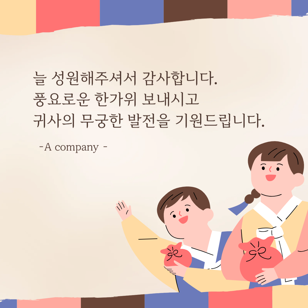1. 늘 성원해주셔서 감사합니다. 풍요로운 한가위 보내시고 귀사의 무궁한 발전을 기원드립니다.